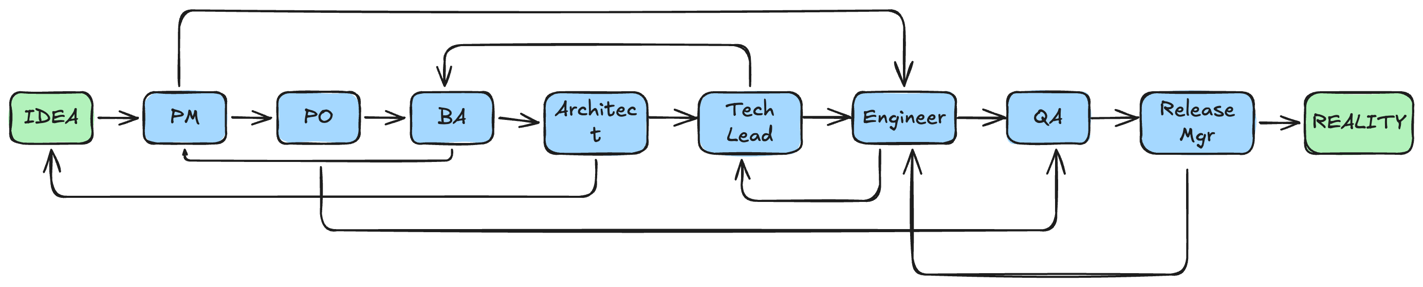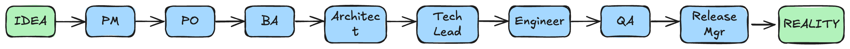 I thought that software went from an IDEA through some PROCESS to REALITY. Zooming in one level of abstraction, we apply different roles, lifecycles and methods of describing. For example, with Roles: